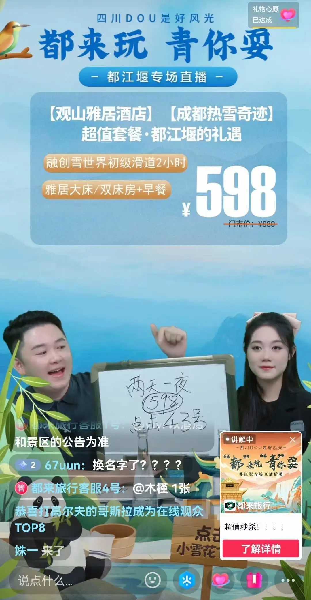 直播中,成都熱雪奇跡、都江堰動(dòng)物王國(guó)、成都融創(chuàng)樂(lè)園、青城豪生酒店、融創(chuàng)宋品酒店等都江堰熱門景點(diǎn)門票和旅游套餐優(yōu)惠力度火力全開(kāi),為粉絲們帶來(lái)了各類“優(yōu)惠大放送”,等待已久的粉絲“魚(yú)躍而入”,留言互動(dòng)瞬間刷屏,粉絲們直呼“贏麻了”!